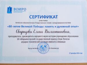 27 декабря 2024 года руководитель народного музея истории учреждения образования Свиридова Е.В. и секретарь совета народного музея Канаш Е.Д. приняли участие в Витебских образовательных Рождественских чтениях с международным участием «80-летие Великой Победы: память и духовный опыт поколений».